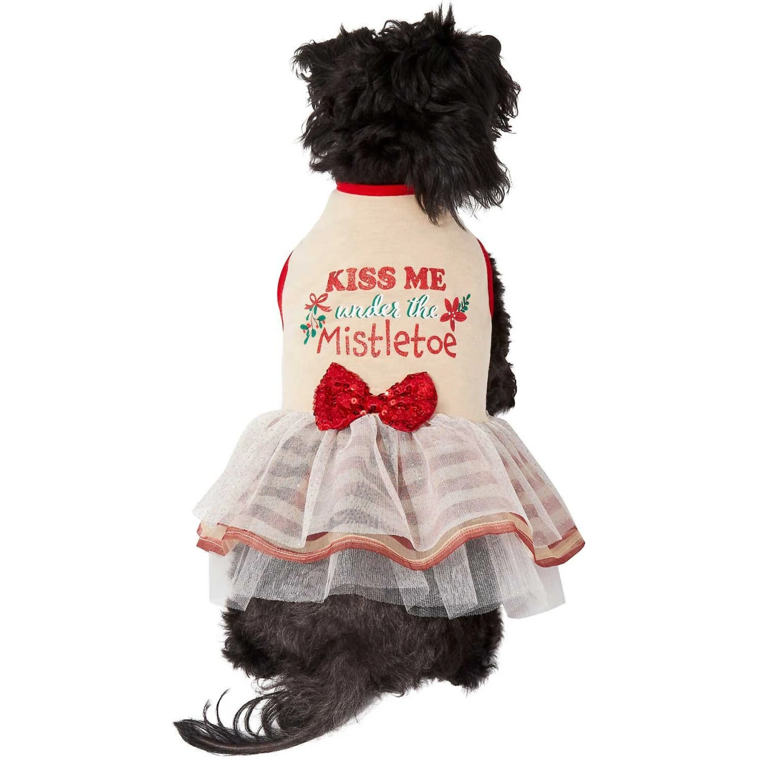 Dress your pet to impress this holiday season! This pullover-style dress is easy to slip on your pet so they can easily go off and strut their stuff all season long. It’s designed with breathable polyester material so your pet can feel comfy while they’re out and about. It features a cute “’Kiss Me Under the Mistletoe” graphic with holly, a red sequin bow and tulle around the skirt for extra festive fashion.